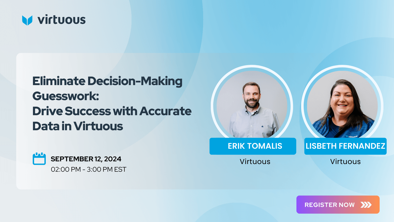 Are you struggling to make informed decisions for your nonprofit due to inaccurate or incomplete data? Join us for a Virtuous webinar where Lisbeth Fernandez, Strategic Solutions Engineer, and Erik Tomalis, Chief Evangelist, will show you how to eliminate guesswork and empower your organization with reliable, actionable insights.