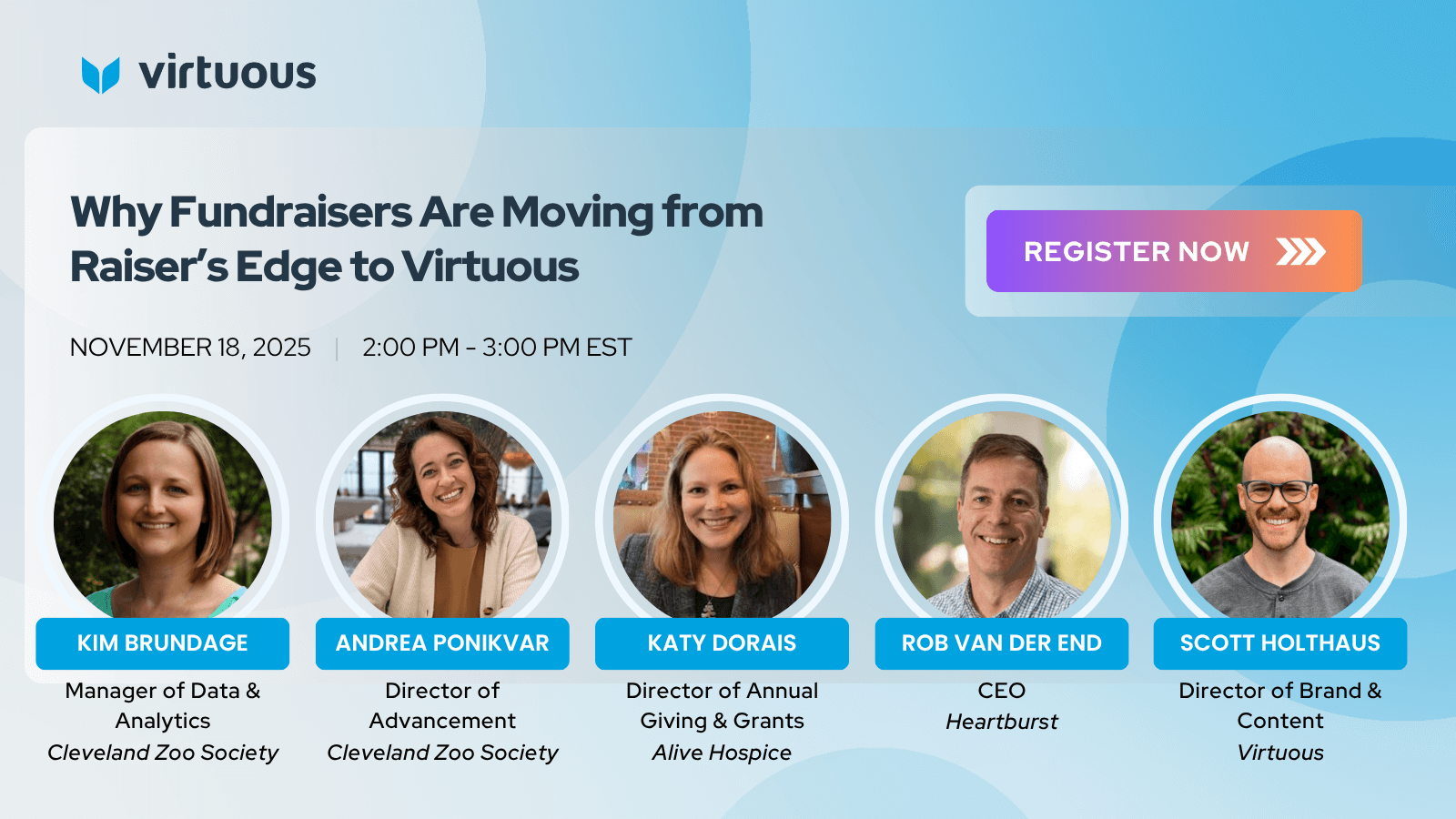 Join Virtuous and Heartburst to hear from fundraisers who have made the move, including leaders from The Cleveland Zoological Society and Alive Hospice.
