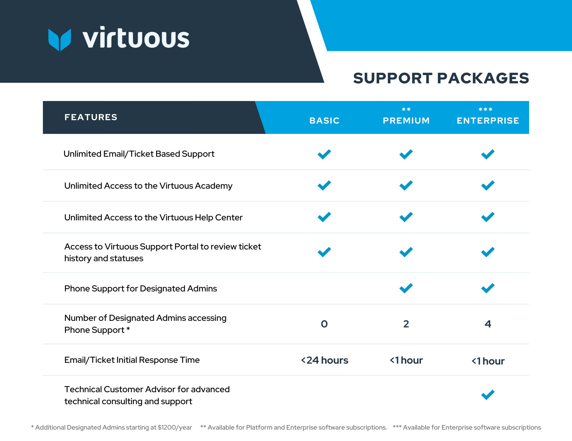 Premium Support packages give you on-demand access to support team members who can help resolve issues or answer your questions quickly. Now, you’re not only getting quicker fixes and expert guidance, you’re also equipping your team to become better Virtuous users while freeing up more of their time to spend on the most mission-critical tasks.