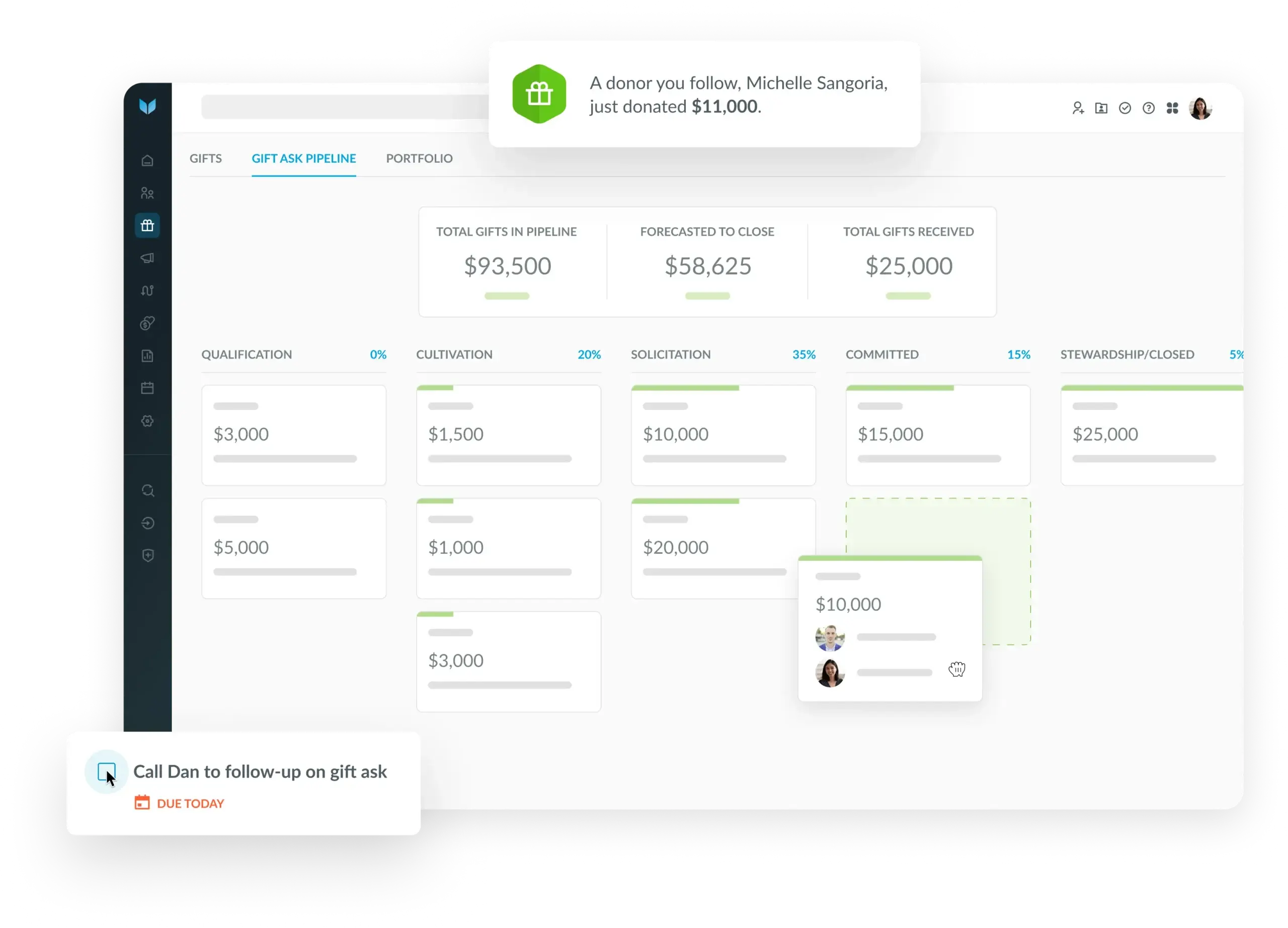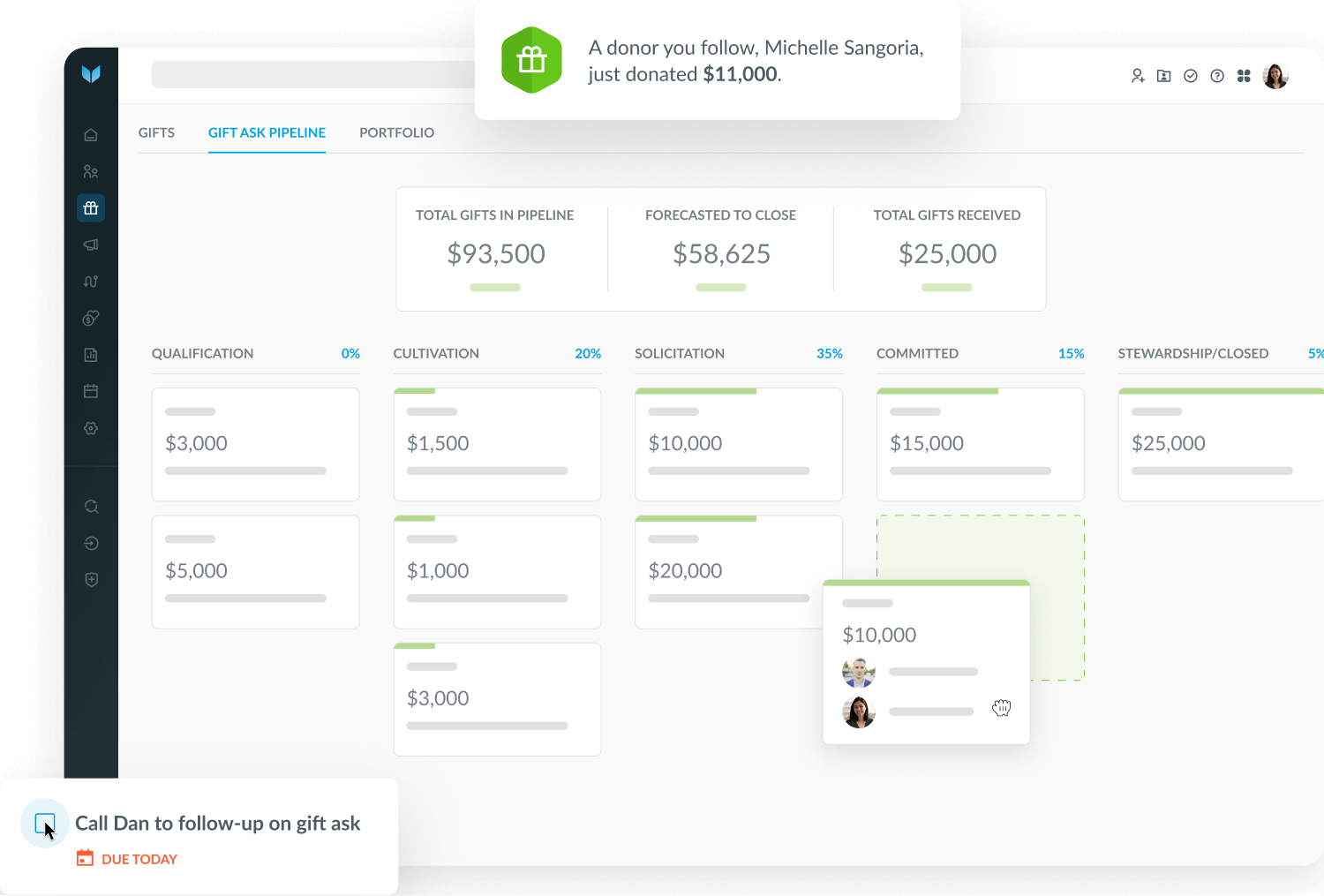 Manage portfolios, track pipeline progress, and forecast major gifts with clarity and confidence.