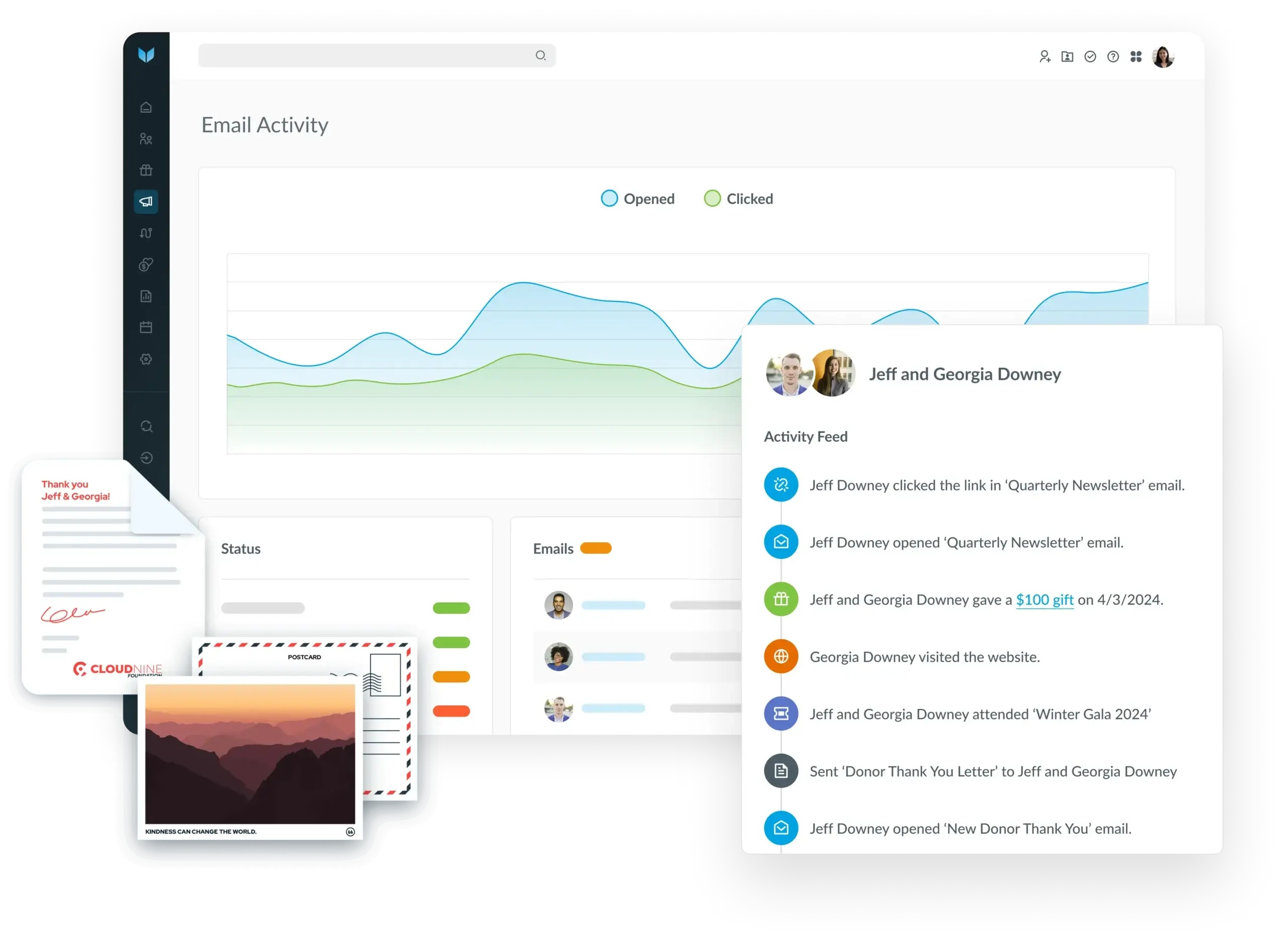 With integrated email marketing, SMS, and physical letters on demand you can send the right message to the right person—without less lift from your team.