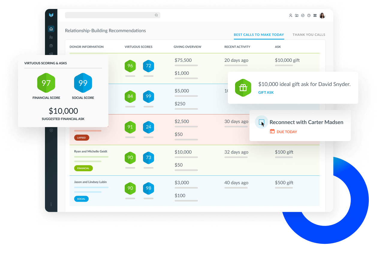From grateful patients to devoted staff and corporate champions, Virtuous provides the fundraising tools to help you connect, inspire, and grow generosity across your entire healthcare ecosystem.