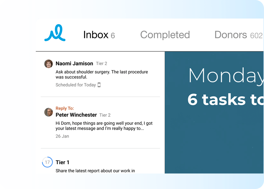 Virtuous Momentum delivers daily AI insights and personalized outreach recommendations for mid and major donor teams. It drafts authentic, relationship-building messages in your voice and syncs every interaction back to your CRM automatically.