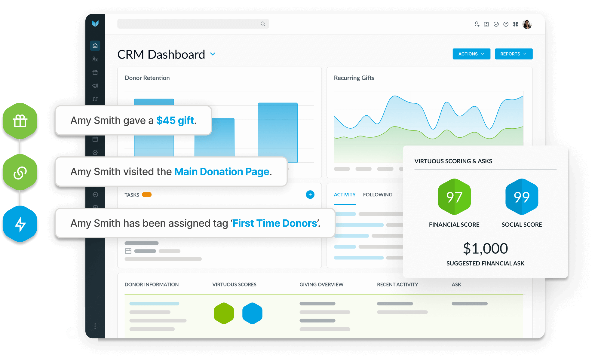 Turn data into actionable insights without needing advanced analytics skills. Virtuous offers straightforward reporting tools to help you monitor progress, refine strategies, and achieve your goals.