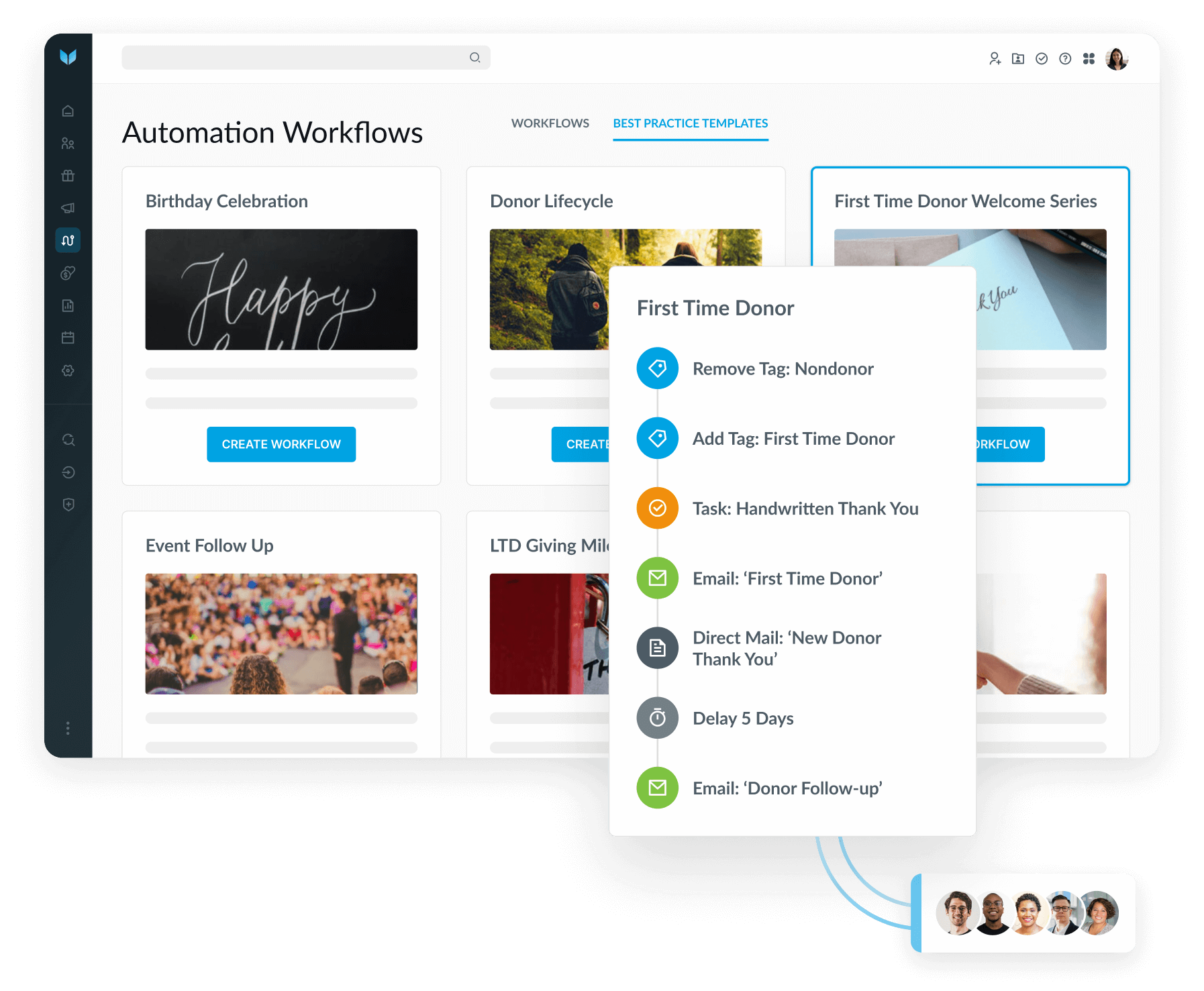 Design personalized donor journeys, plus automate back-office processes and task management.